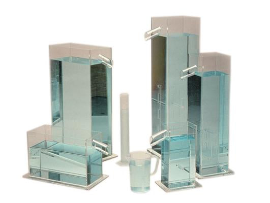 The volumetric measuring device is designed to objectively measure volume of the body part by using the fluid displacement method. The body part is placed in a water-filled tank. The resultant overflow is collected and measured. By taking measurements over time, amount of edema can be measured and quantified. Sets include volume meter, overflow cup and measurement vessel.