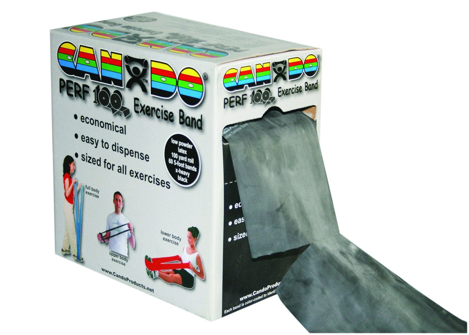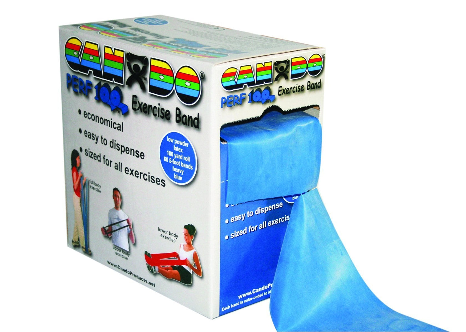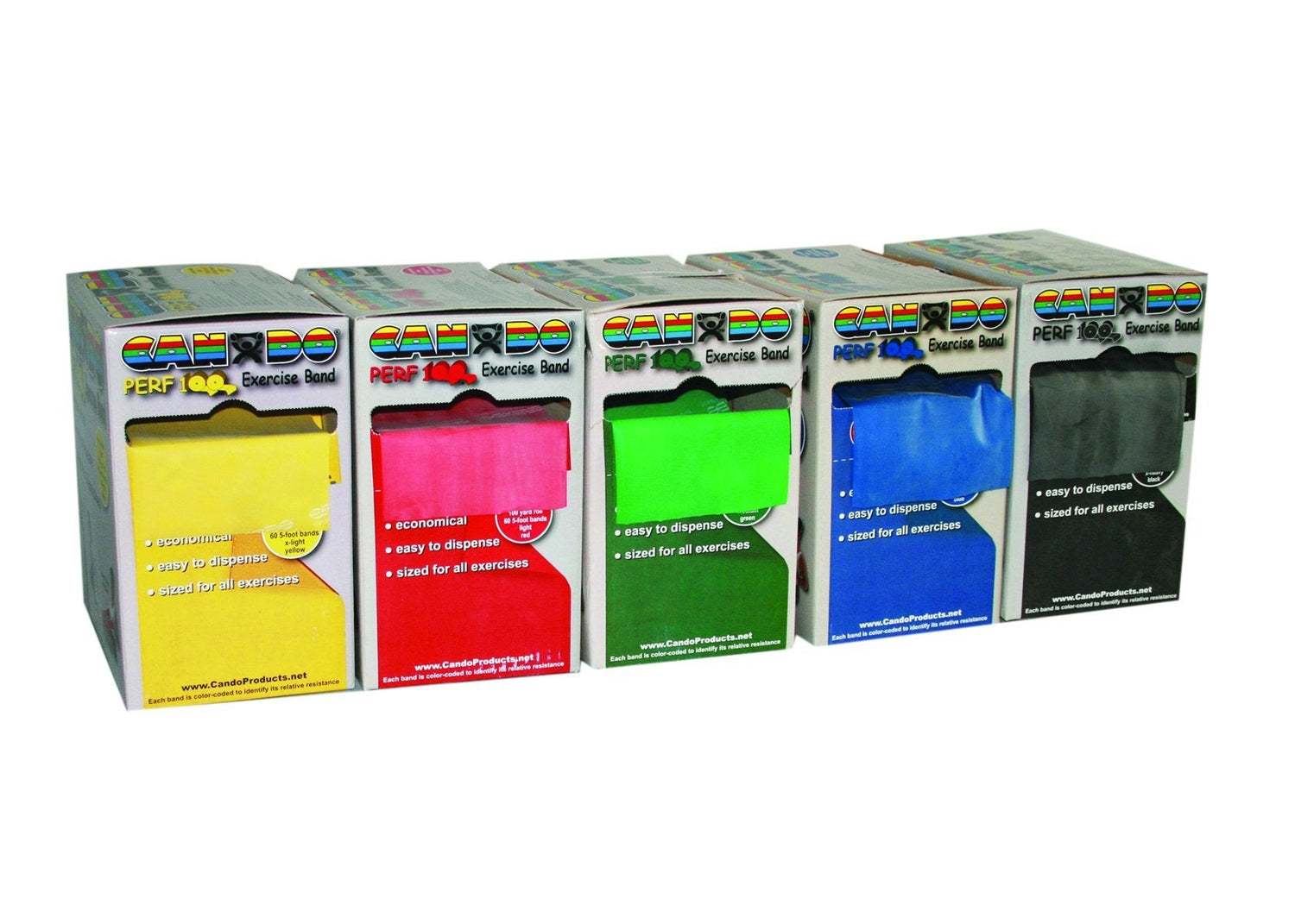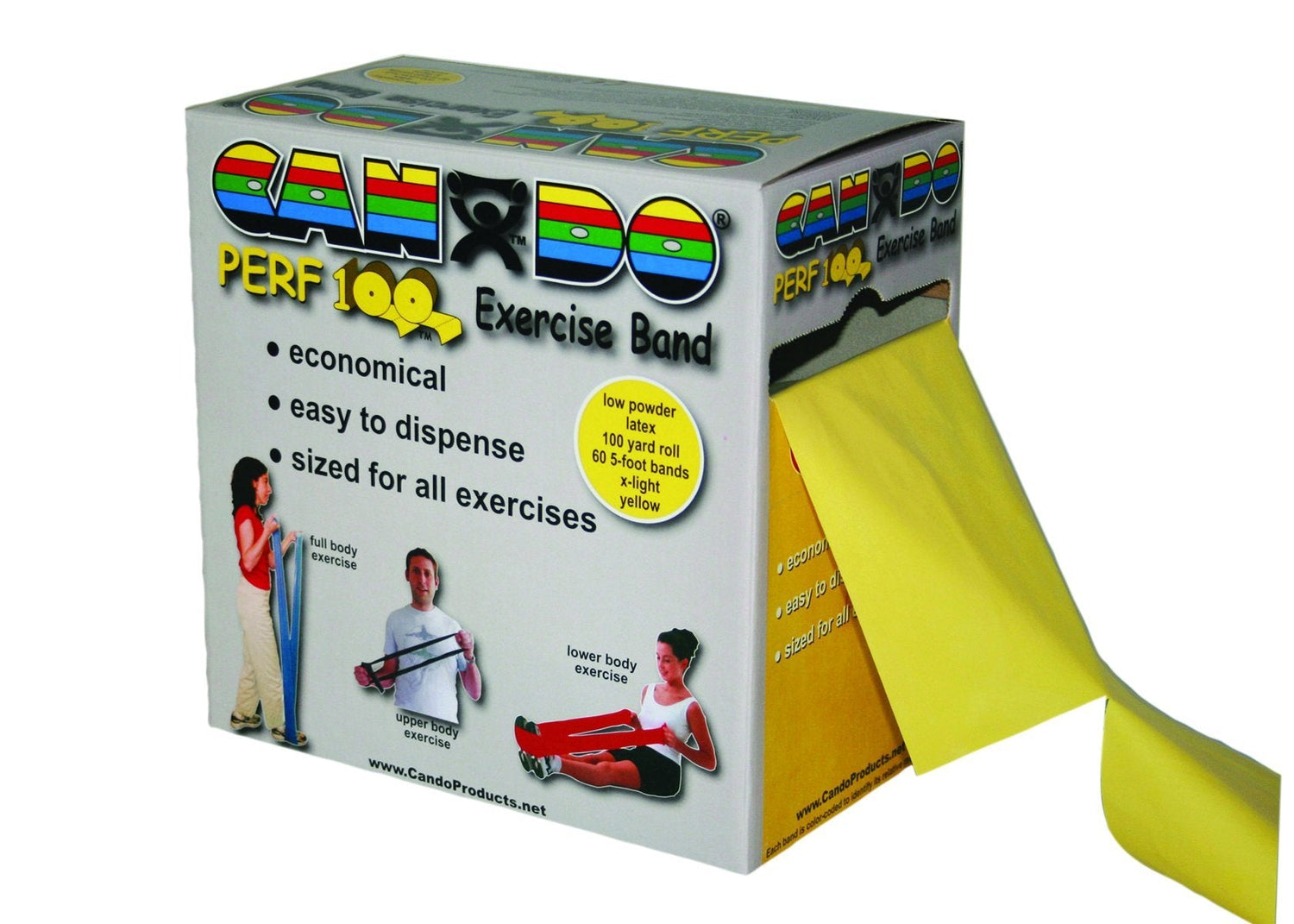 CanDo Perf 100 economic bulk size roll is the best value for large clinics. The CanDo Perf 100 offers a true 100 yard roll of exercise band in a convenient dispenser box. The band is perforated every 5 feet. There are 60 5-foot exercisers in each roll. To prepare exercise band for use simply pull 5 foot length from dispenser box and separate perforation line by hand. No scissors are needed!. CanDo high quality latex resistive exercise band has been used in clinics for rehabilitation, conditioning and training since 1987. It has become a well known staple of many physical therapy programs. CanDo exercise band is an economic solution for upper and lower body exercise. Lightweight, compact and portable. Durable. Effective when used alone, or with handles and anchors. Color-coded according to the exercise band's resistance. CanDo is licensed to use the Thera-Band color sequence so resistance level is easily identified. Available in 8 levels of resistance for progressive exercise. Levels range in order of strength from least to greatest resistance: tan, yellow, red, green, blue, black, silver, gold. Uniform width - each band is 5" wide. CanDo low powder exercise band is made of natural rubber latex, which may cause allergic reactions. For those with latex sensitivities, there are latex-free alternative offerings of CanDo exercise band.