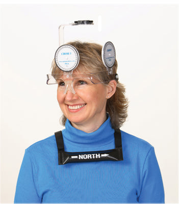 The CROM 3 is the next generation of inclinometer based measurement instruments. Like the original CROM, it has a patented mainframe and rotation unit for range of motion measurements, but with the addition of three-inch ball inclinometers, it is easier to read and use. The ball technology reduces the inclinometer sensitivity to vertical positioning and the three-inch inclinometers read to one degree. The CROM 3 can be used for all cervical range of motion measurements. A specially adapted head forward unit for protrusion, retraction and dorsal glide can be purchased separately.