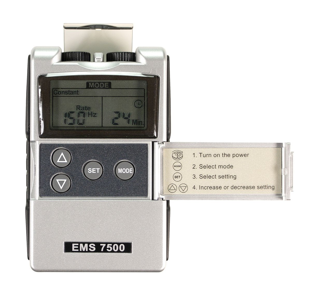 The EMS 5.0 unit uses electrical impulses to contract and relax muscles helping those who experience muscle tension in the upper back and neck areas. Can be used to regain muscle strength after surgery or after being in a cast. The EMS unit is portable and may be clipped to a belt, shirt, pocket or other clothing. System includes device, lead wires, four self-adhesive reusable electrodes, 9-volt battery, hard plastic carrying case and instruction manual. 105 mA strong. Power Source: 9-volt battery. Channel: Dual, isolated between channels. Pulse Width: 250 microseconds. Pulse Rate: 5, 30, 100 Hz. Pulse Ramp: 1, 3, 5 seconds. Pulse Amplitude: Adjustable, 0-80 mA. Contraction Control: 1-30 seconds. Relaxation Control: 1-45 seconds. Wave Form: Asymmetrical Bi-Phase Square Pulse.