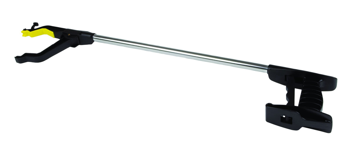 Lightweight reacher has an ergonomic trigger that is operated with whole hand. It is constructed with wired-driven jaws and the frame resists twisting and bending. It includes magnet for picking up metal objects and a hook to aid with dressing. These reaching aides assist individuals with limited reach and hand strength.