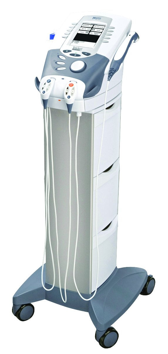 Intelect Legend XT 2-channel stim and ultrasound unit. Stim unit offers 6 clinical waveforms including: interferential, Russian, bi-phasic, high volt, microcurrent, and premodulated. Full functioning ultrasound delivers 1 and 3.3 MHz through a 5cm2 applicator. Multiple waveforms available in combination mode. Built-in patient data card device can record patient modality and pain profile information. Each unit ships with 5 Patient Data Cards, 4 each 3" inch diameter carbon electrodes (2 red, 2 black), 4 each DuraStick II 2-3/4 inch diameter electrodes and 1 2½ x 24 inch Nylatex wrap. Mobile cart (sold separately) has 6 storage bins to minimize cord and cable hassle.