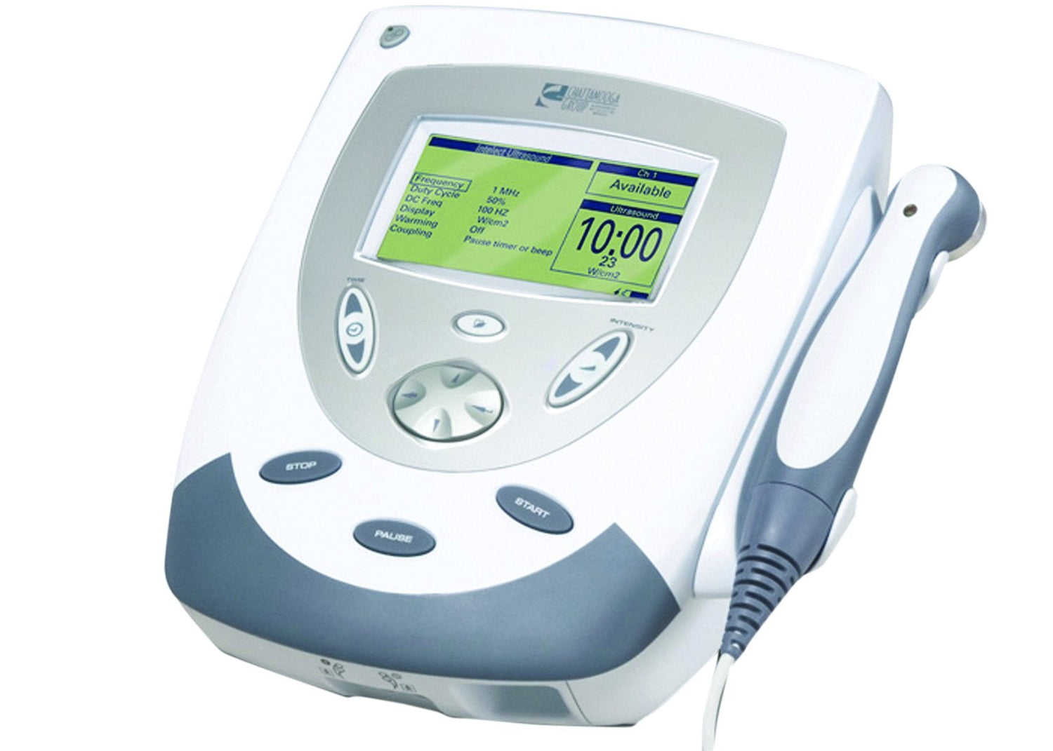 Intelect Transport 2-channel stim and ultrasound combo unit features fully functional 1 and 3.3 MHz ultrasound frequencies. Two channels of electrical stimulation output. Ten user-defined memory positions for User Protocols. Four standard waveforms on board: Interferential, Premodulated, High Volt, and Russian. Pulsed and continuous therapy operation (10%, 20%, 50% and 100%). Independent intensity and parameter controls for each channel. Ergonomically designed Sound Head Applicators available in a variety of sizes (1 cm², 2 cm², 5 cm² and 10 cm²). All Sound Head Applicators are interchangeable with Electronic Signature residing on all transducers. Watertight sound heads for use in underwater therapy. Head-warming feature on all sound Head Applicators. Unit uniquely designed for tabletop, wall mount, therapy cart (sold separately) or mobile use. 110V or battery powered (battery pack sold separately) option.