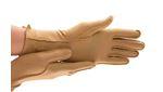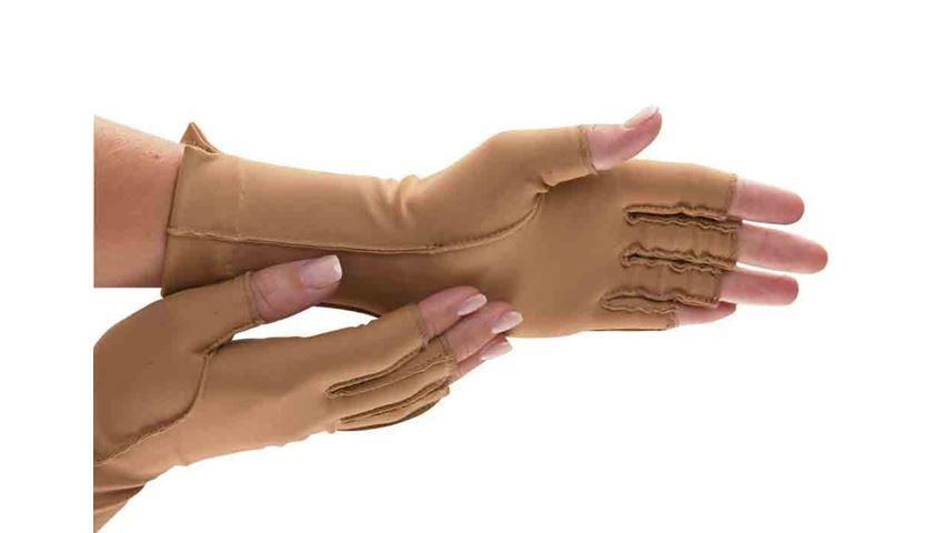 Isotoner Therapeutic Gloves Moderate compression helps ease pain and swelling due to arthritis or injury. Seams are on outside and away from pain sensitive areas. Use day or night during rest and activity. Compression estimated from circumference around knuckles at 23-32 mmHg. Fiber content: 80% Nylon, 20% Lycra Spandex. Not made with natural rubber latex.