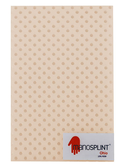 Manosplint Ohio S material is a non-coated material that self-bonds, acting as a second pair of hands to keep the device in place during application. Ohio S becomes translucent when it is heated, allowing the therapist to clearly see target areas and minimize patient discomfort. The perforated surface allows for air circulation without sacrificing rigidity. Ohio S is available with 11%, 15%, and 19% surface perforation.