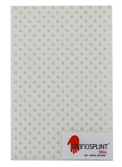 Manosplint Ohio material is a coated material that will not adhere to itself until the coating is removed. Ohio becomes translucent when it is heated, allowing the therapist to clearly see target areas and minimize patient discomfort. The perforated surface allows for air circulation with sacrificing rigidity. Ohio is available with 1%, 11%, 15%, 19%, 36%, and 42% surface perforation.