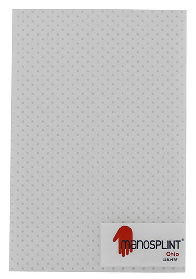 Manosplint Ohio material is a coated material that will not adhere to itself until the coating is removed. Ohio becomes translucent when it is heated, allowing the therapist to clearly see target areas and minimize patient discomfort. The perforated surface allows for air circulation with sacrificing rigidity. Ohio is available with 1%, 11%, 15%, 19%, 36%, and 42% surface perforation.