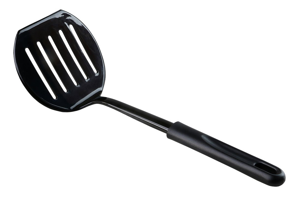 The Nylon Spatula is great for safe handling of thermoplastics. It features an extra wide head for easy lifting of warm thermoplastics out of heating pans. It is heat resistant up to 450 degrees Fahrenheit and has a tapered edge that decreases marks to the splint. The Nylon Spatula is made of a nylon construction and is dishwasher safe. It is black in color and is 11 ½ inches in length.
