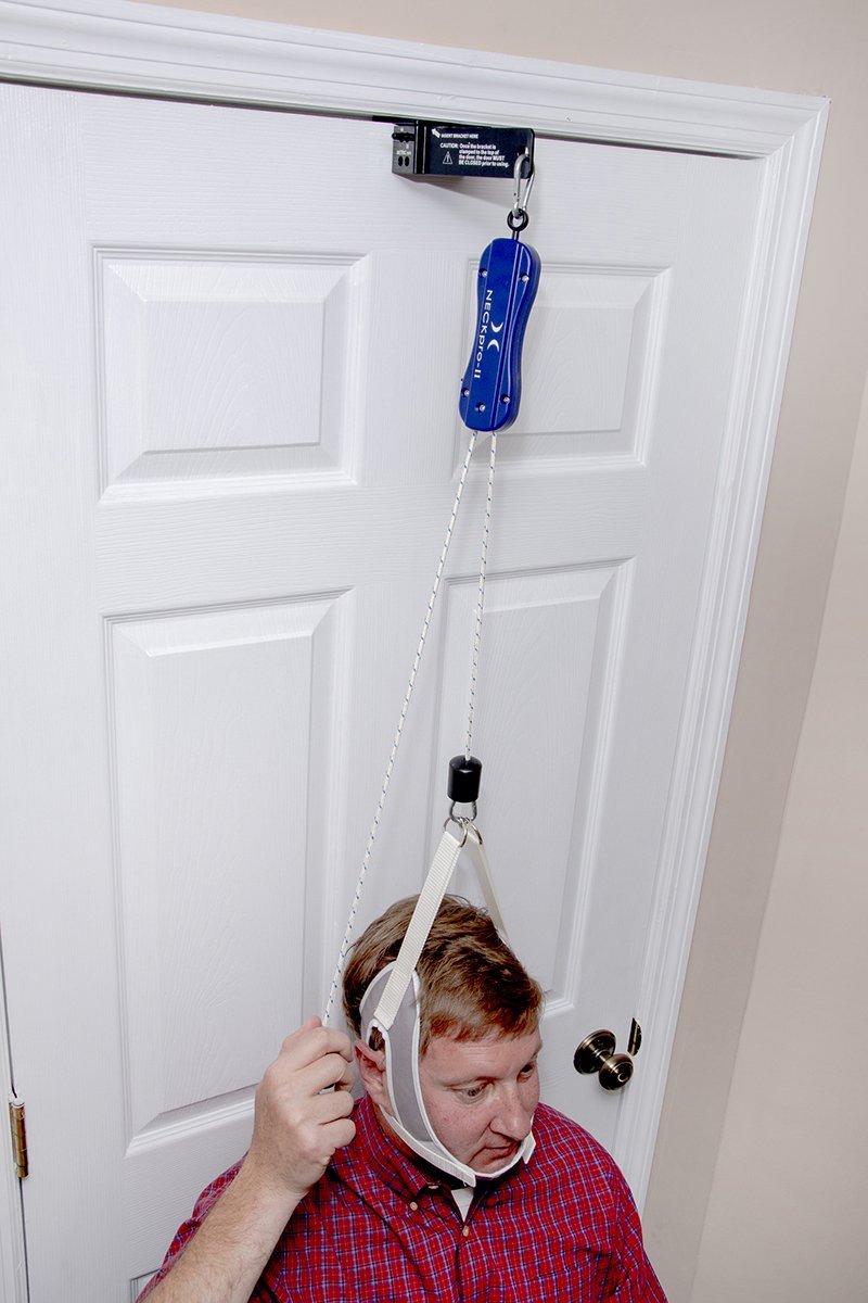 NeckPro II significantly reduces neck pain and is easy-to-use at home. Unlike other cervical traction devices, which may rely on water-bags or heavy weights to create the therapeutic tension, the NeckPro II relies on a simple cord device. With every pull and click of the cord, the tension increases by approximately one pound. A maximum of 25lbs of tension is possible.