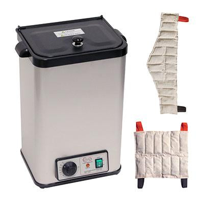 This Relief Pak Heating Unit has the capacity to hold and heat 4 moist heat packs up to 175? in an insulated hot water bath. Moist heat and moist heat packs help treat acute and chronic pain, relieve aches and ease soreness and stiffness. They are ideal for recovery use post-injury and post-workout with a material that conforms to any body part and is pliable when heated. Moist heat is also more effective in deeper tissue heating and penetrates further than dry heat at the same temperature. This heating unit has an adjustable temperature control and features a glowing orange light that illuminates when the unit has reached its desired temperature. For best results, use moist heat packs at 160?. The unit?s compact stationary design allows it to easily sit on countertops. This heater, which runs on 110V, can store and heat up to 3 Standard and 1 Neck Relief Pak moist heat packs, which are included. Also comes with a removable plug set and fully illustrated user manual. Made from durable stainless steel that's perfect for high traffic clinics, the insulated design retains heat and keeps it from dispersing out of the unit. The on/off switch glows green when the unit is in use. Each moist heat pack delivers up to 30 minutes of hot, moist, therapeutic relief. Handle pack by the corner tab and wrap in a towel or covering before use. The heat packs are also reusable. Once drained, the unit is easy to clean. Use a soft cloth, sponge or non-abrasive cleaning pad to wipe down the unit and mild soaps and non-abrasive detergents to clean the surfaces. Do not use steel wool, bleach or cleaners with high chlorine contents. Versatile Relief Pak Heaters and Moist Heat Packs are designed for use at home or in multi-user environments. That?s why they?re highly recommended by physiotherapists, physicians, chiropractors, athletic trainers and kinesiologists.